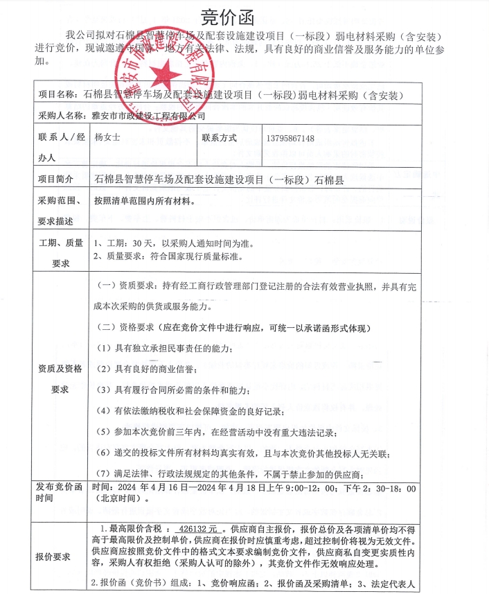 石棉縣智慧停車場(chǎng)及配套設(shè)施建設(shè)項(xiàng)目(一標(biāo)段)弱電材料采購(含安裝)競價(jià)公告