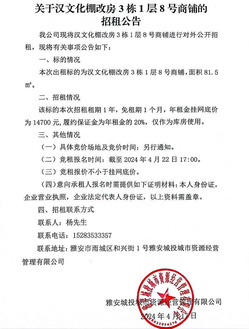 關于漢文化棚改房3棟1層8號商鋪的招租公告