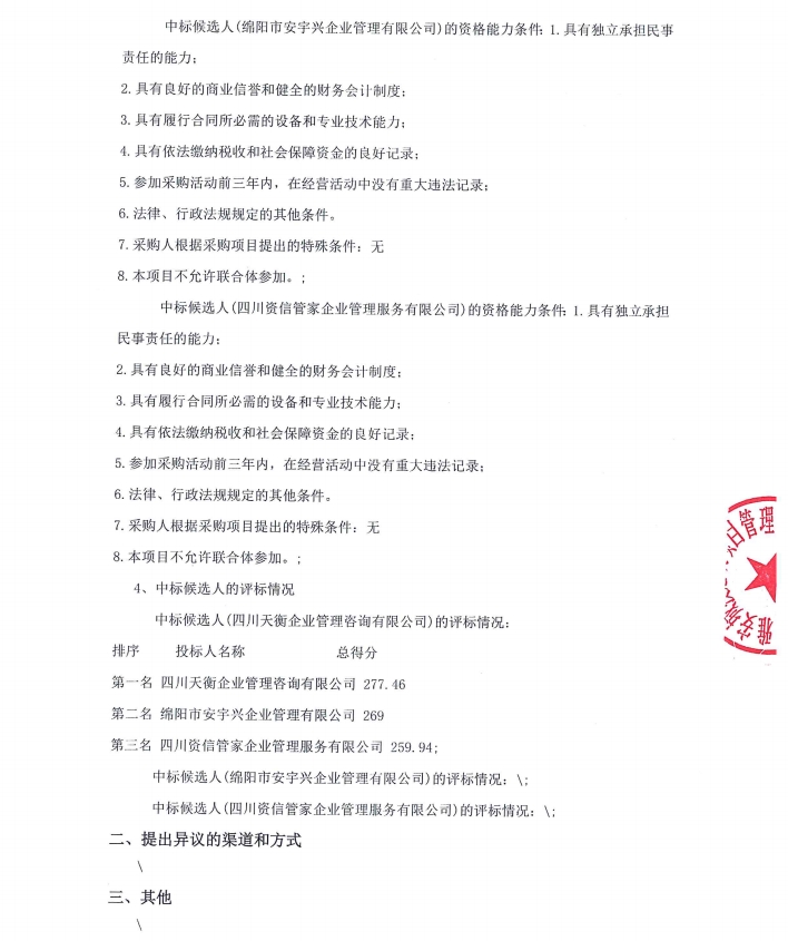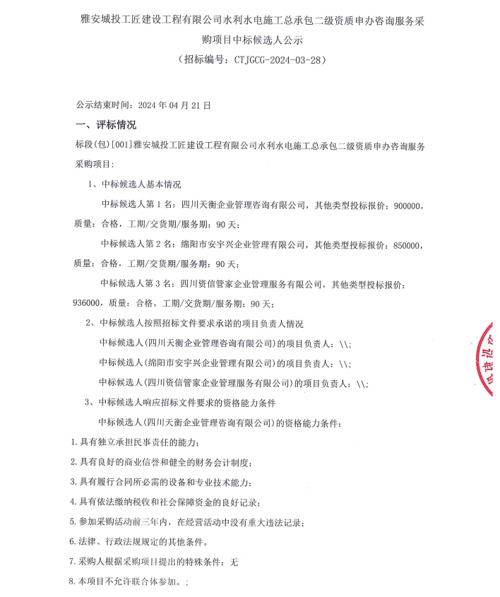 雅安城投工匠建設(shè)工程有限公司水利水電施工總承包二級資質(zhì)申辦咨詢服務(wù)采購項目中標候選人公示
