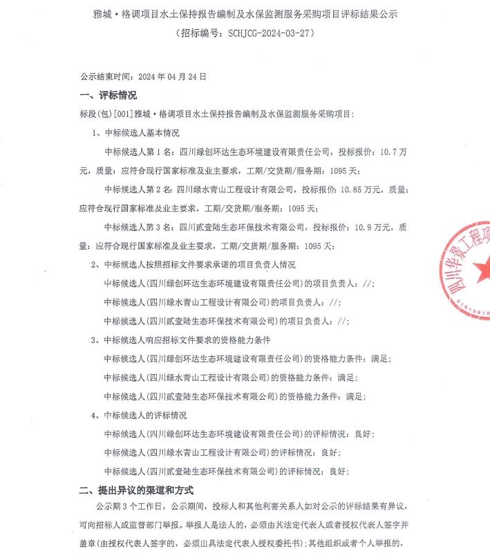 雅城·格調(diào)項(xiàng)目水土保持報(bào)告編制及水保監(jiān)測(cè)服務(wù)采購項(xiàng)目評(píng)標(biāo)結(jié)果公示