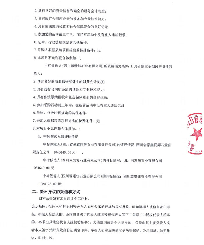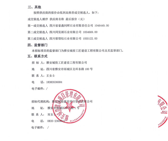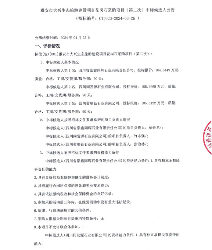 雅安市大興生態(tài)旅游建設項目花崗石采購項目(第二次)中標候選人公告