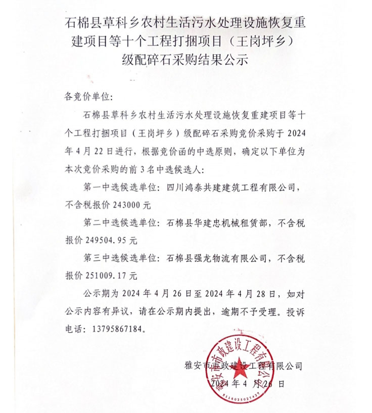 石棉縣草科鄉(xiāng)農(nóng)村生活污水處理設(shè)施恢復(fù)重建項(xiàng)目等十個工程打捆項(xiàng)目(王崗坪鄉(xiāng))級配碎石采購結(jié)果公示