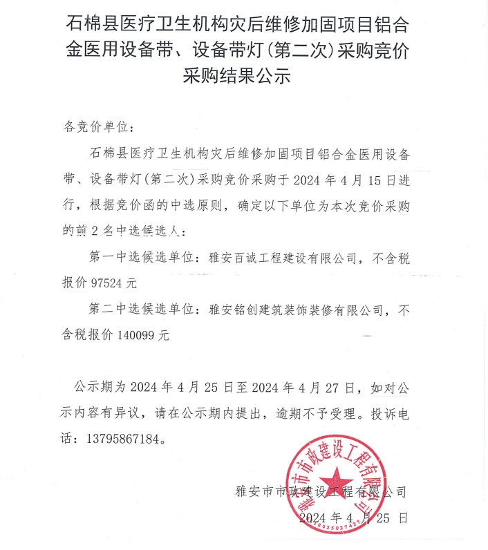 石棉縣醫(yī)療衛(wèi)生機構(gòu)災后加固改造項目鋁合金醫(yī)用設(shè)備帶、設(shè)備帶燈(第二次)采購競價采購結(jié)果公示