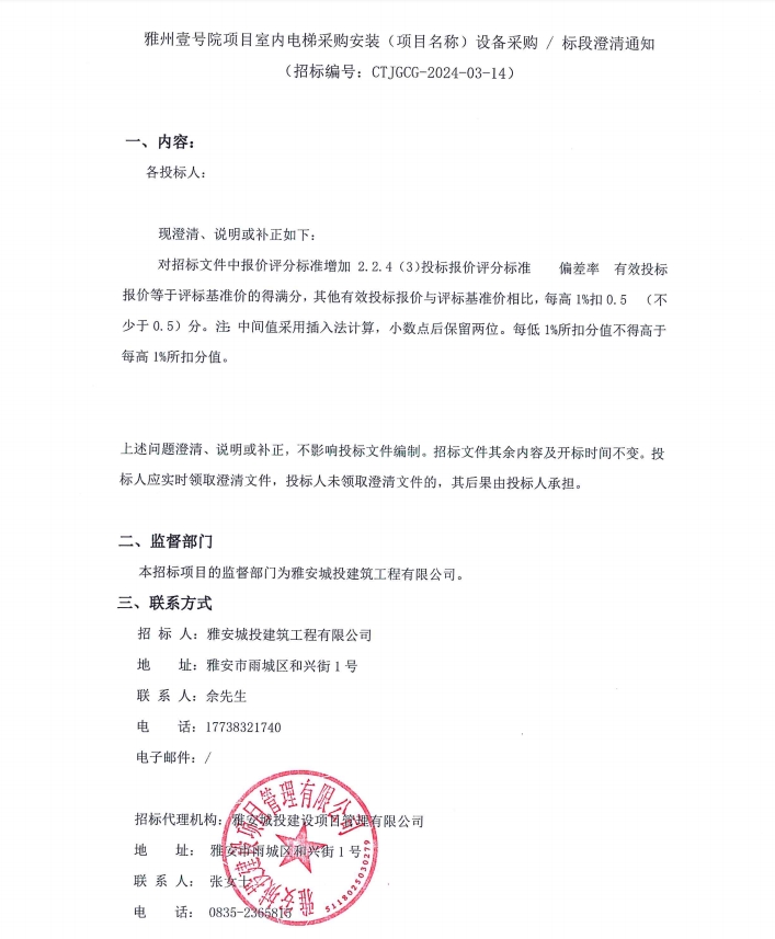 雅州壹號(hào)院項(xiàng)目室內(nèi)電梯采購(gòu)安裝(項(xiàng)目名稱(chēng))設(shè)備采購(gòu)/標(biāo)段澄清通知
