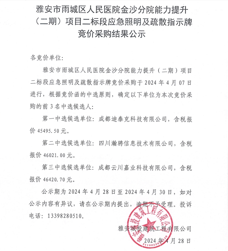 雅安市雨城區(qū)人民醫(yī)院金沙分院能力提升(二期)項目二標段應急照明及疏散指示牌競價采購結果公示