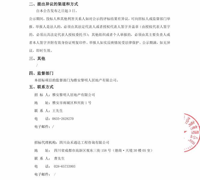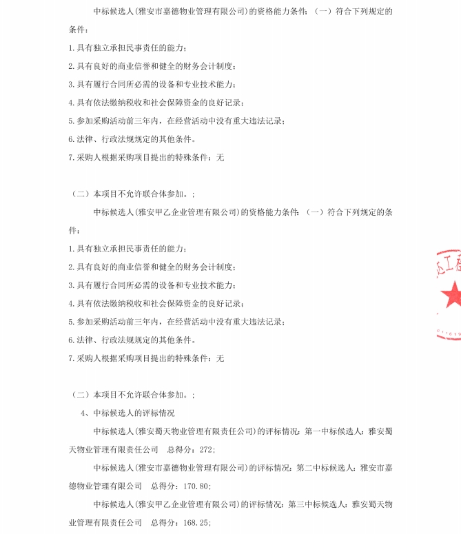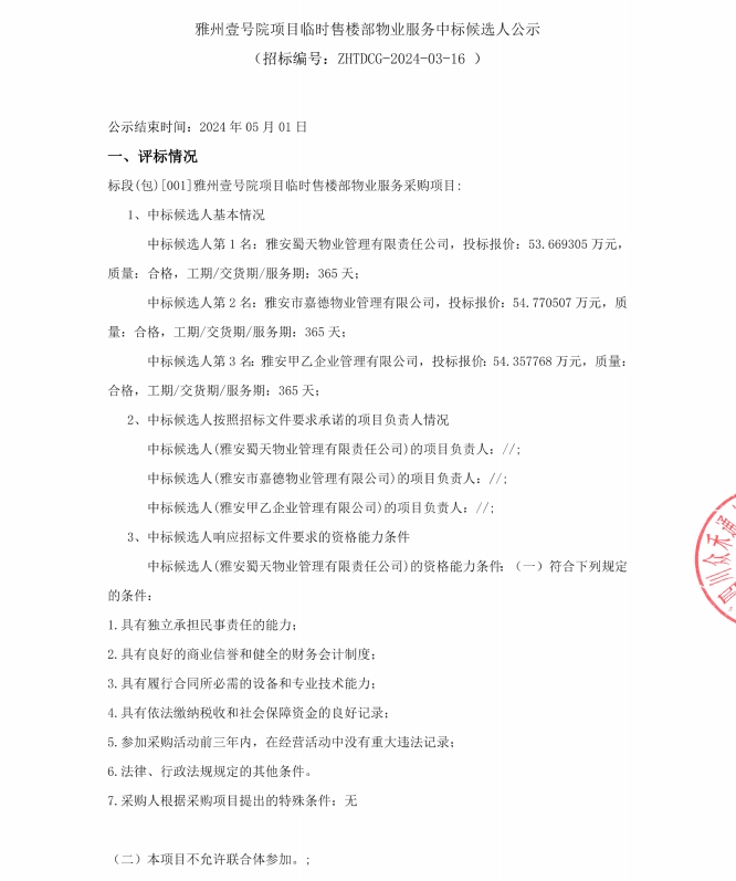 雅州壹號院臨時售樓部物業(yè)服務中標候選人公示