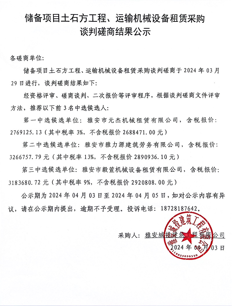 儲備項(xiàng)目土石方工程、運(yùn)輸機(jī)械設(shè)備租賃采購談判磋商結(jié)果公示