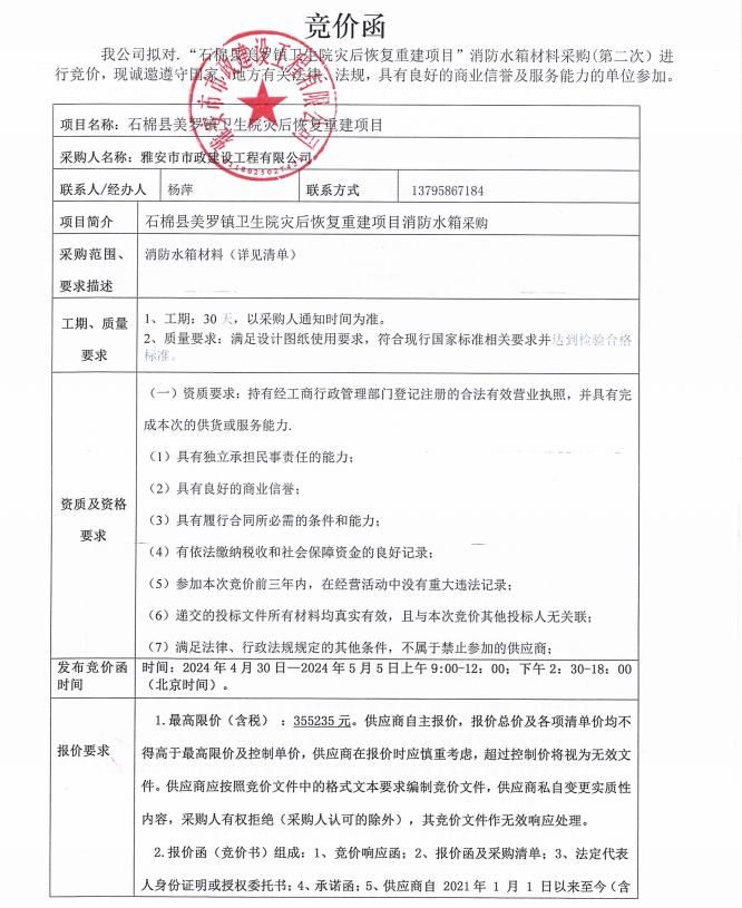 石棉縣美羅鎮(zhèn)衛(wèi)生院災(zāi)后恢復(fù)重建項(xiàng)目消防水箱采購(第二次)競價(jià)公告