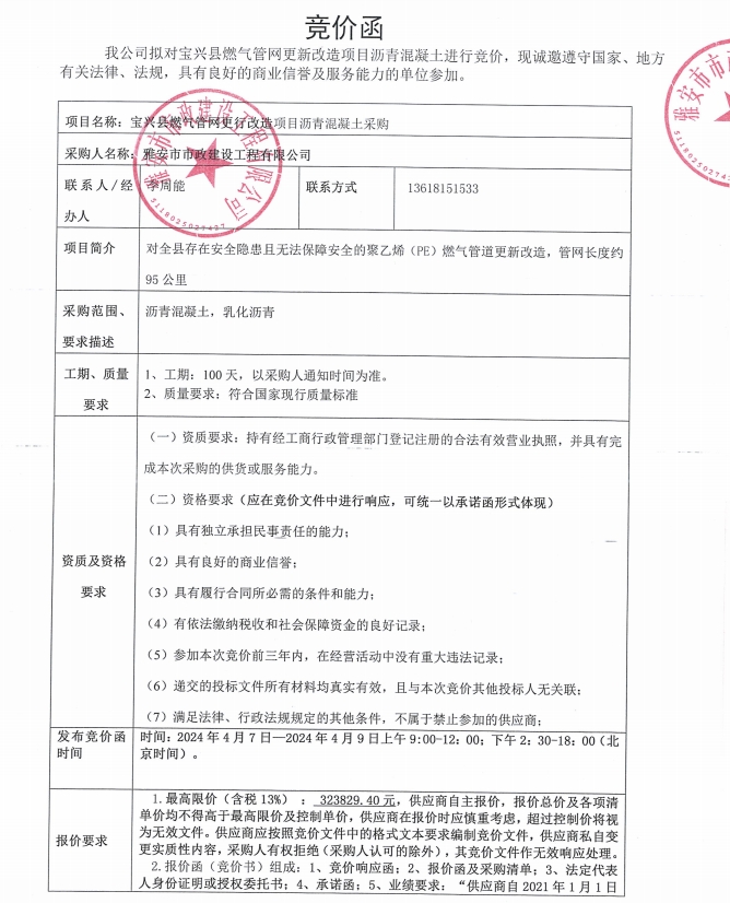 寶興縣燃?xì)夤芫W(wǎng)更新改造項(xiàng)目瀝青混凝土競(jìng)價(jià)公告