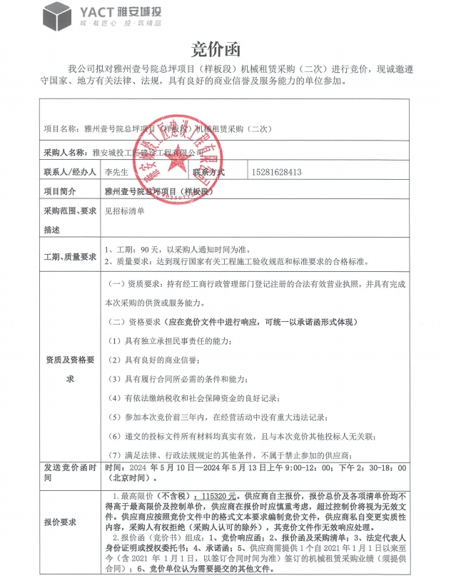 雅州壹號院總坪項目(樣板段)機械租賃采購(二次)競價公告