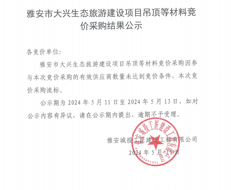 雅安市大興生態(tài)旅游建設(shè)項(xiàng)目吊頂?shù)炔牧细們r(jià)采購結(jié)果公示