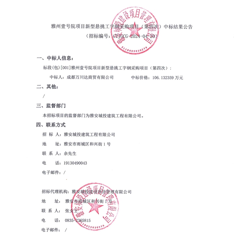 雅州壹號院項目新型懸挑工字鋼采購項目(第四次)中標結(jié)果公告