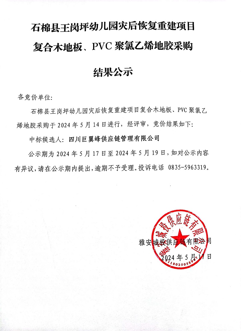 石棉縣王崗坪幼兒園災后恢復重建項目復合木地板、PVC聚氯乙烯地膠采購結(jié)果公示
