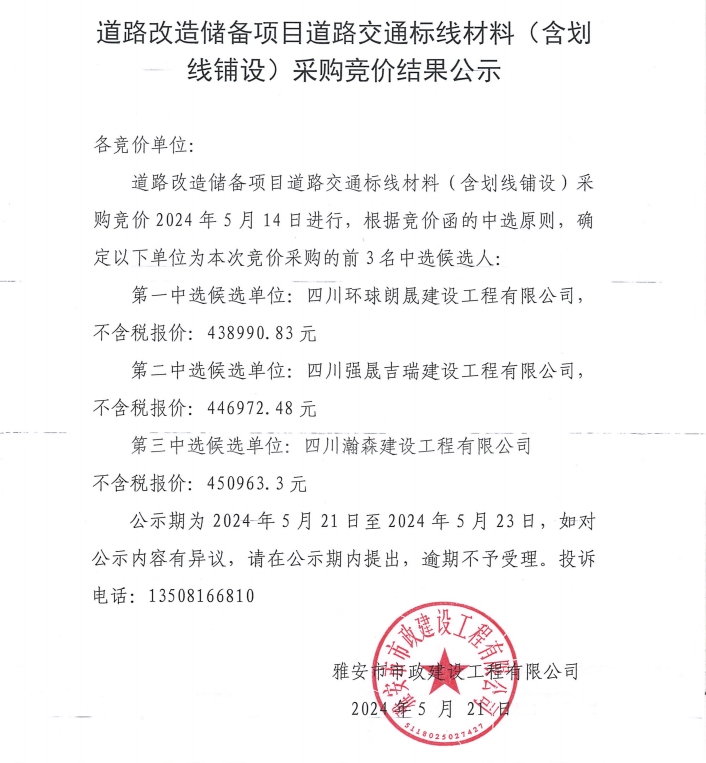 道路改造儲(chǔ)備項(xiàng)目道路交通標(biāo)線材料(含劃線鋪設(shè))采購(gòu)競(jìng)價(jià)結(jié)果公示