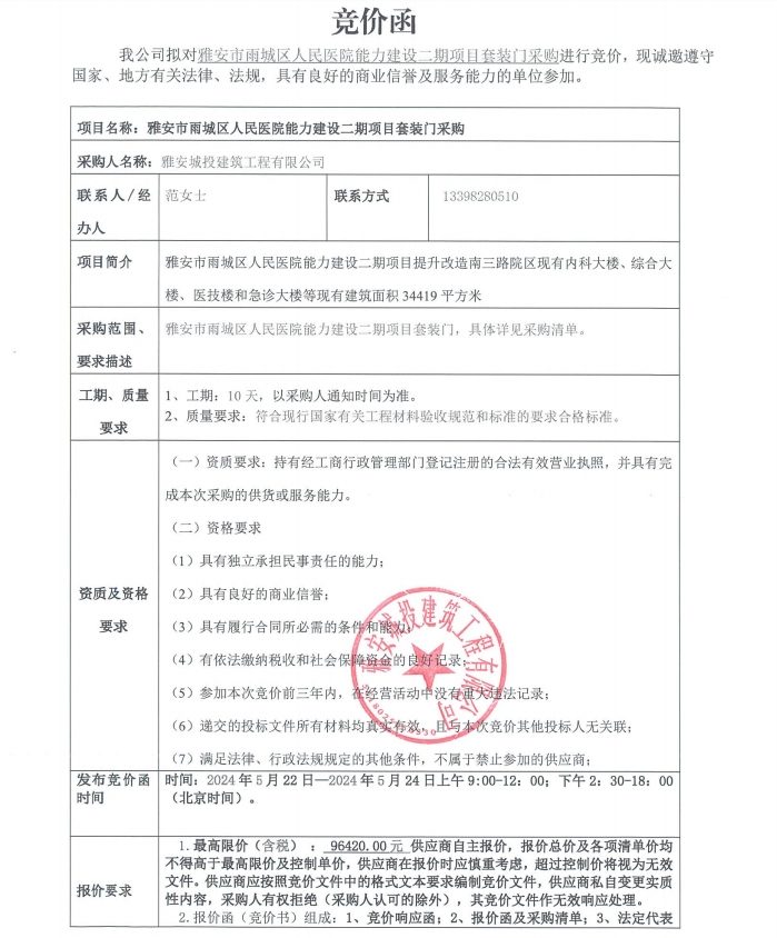 雅安市雨城區(qū)人民醫(yī)院能力建設(shè)二期項(xiàng)目套裝門采購競(jìng)價(jià)公告