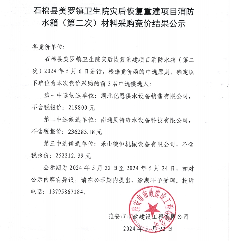 石棉縣美羅鎮(zhèn)衛(wèi)生院災(zāi)后恢復(fù)重建項(xiàng)目消防水箱(第二次)材料采購(gòu)競(jìng)價(jià)結(jié)果公示