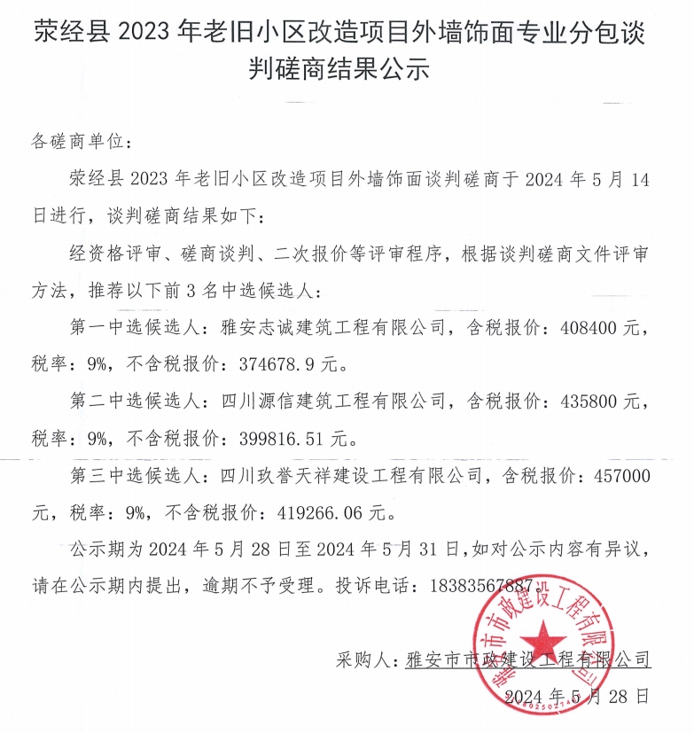 滎經(jīng)縣2023年老舊小區(qū)改造項目外墻飾面專業(yè)分包談判磋商結果公示