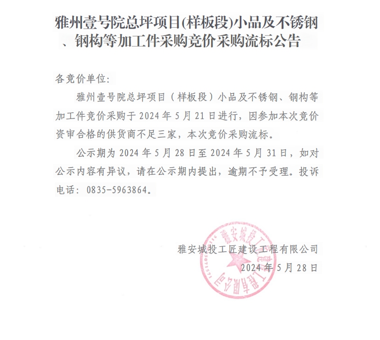 雅州壹號(hào)院總坪項(xiàng)目(樣板段)小品及不銹鋼、鋼構(gòu)等加工件采購競價(jià)采購流標(biāo)公告