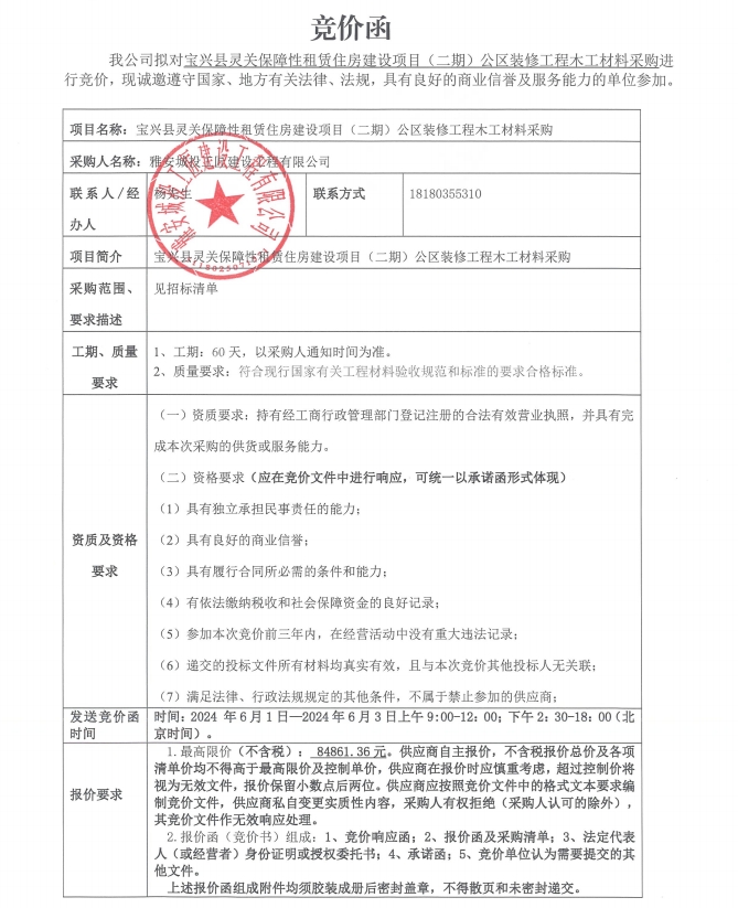 寶興縣靈關(guān)保障性租賃住房建設(shè)項(xiàng)目(二期)公區(qū)裝修工程木工材料采購(gòu)競(jìng)價(jià)公告