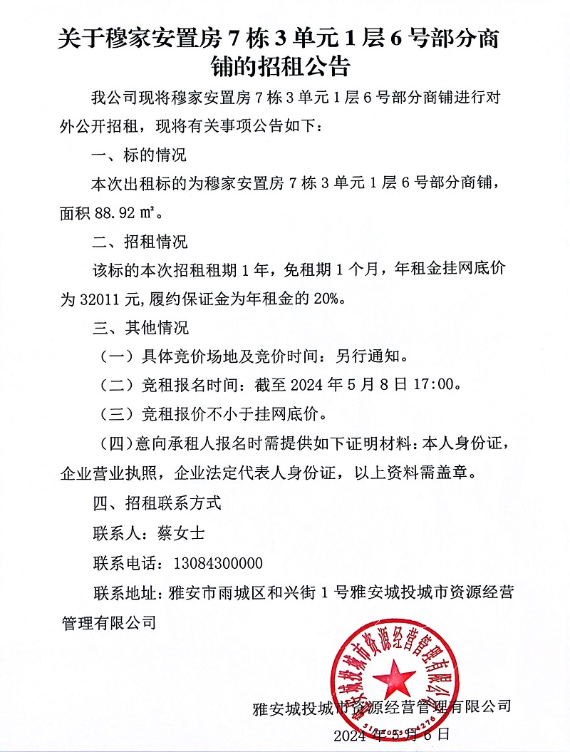 關(guān)于穆家安置房7棟3單元1層6號(hào)部分商鋪的招租公告