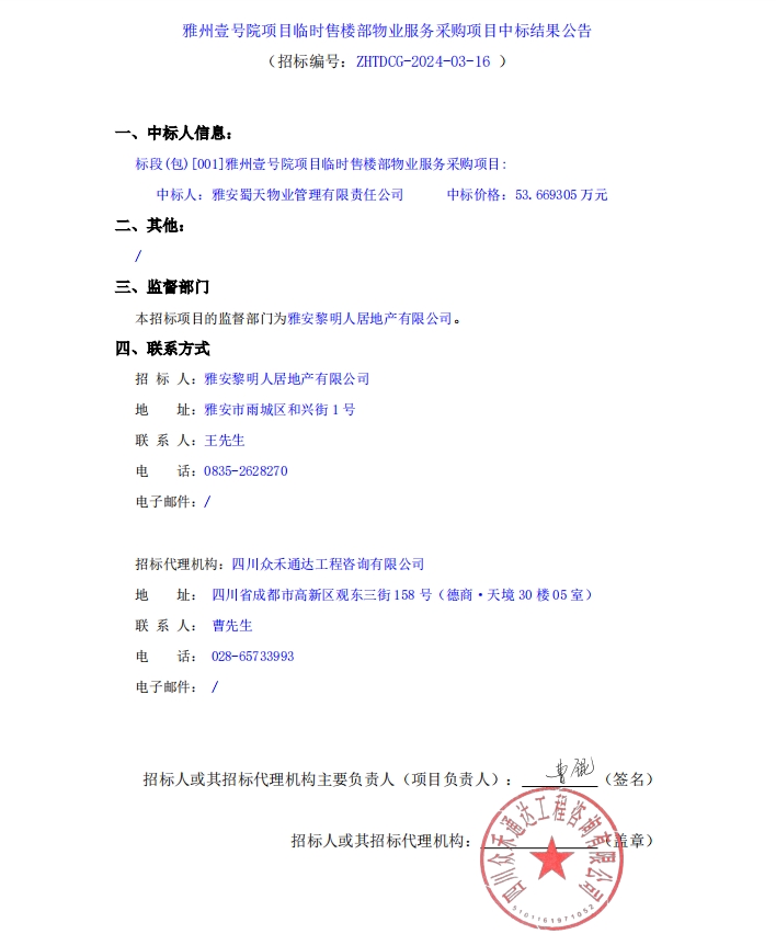 雅州壹號(hào)院項(xiàng)目臨時(shí)售樓部物業(yè)服務(wù)采購項(xiàng)目中標(biāo)結(jié)果公告