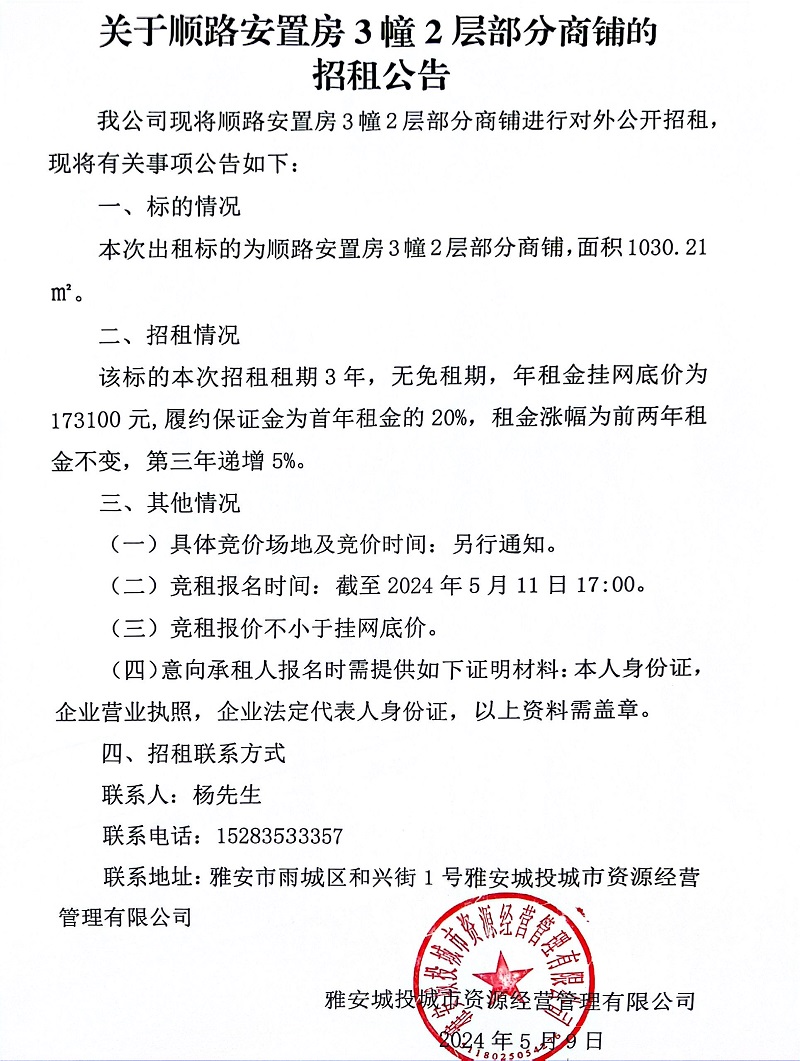 關(guān)于順路安置房3幢2層部門(mén)商鋪的招租公告
