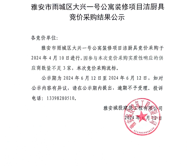 雅安市雨城區(qū)大興壹號(hào)公寓裝修項(xiàng)目潔廚具競價(jià)采購結(jié)果公示