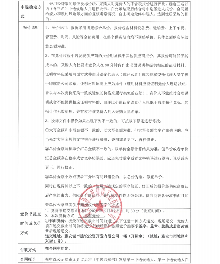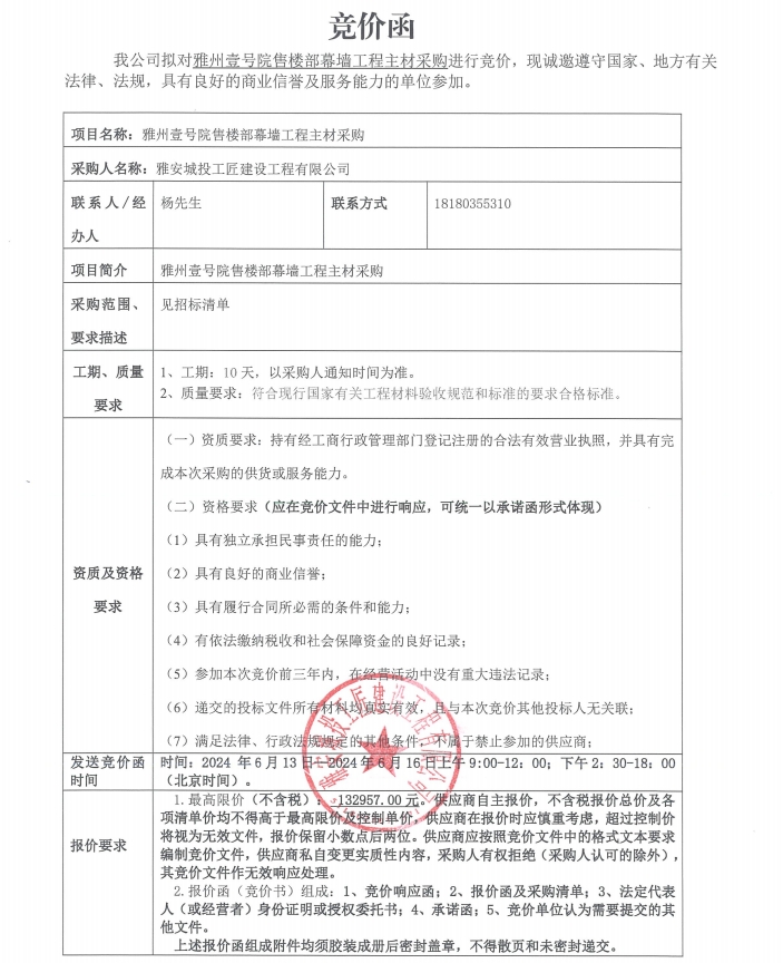 雅州壹號院售樓部幕墻工程主材采購競價公告