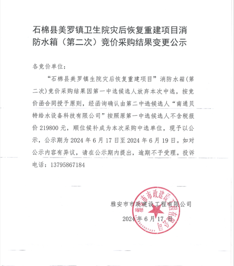 石棉縣美羅鎮(zhèn)衛(wèi)生院災(zāi)后恢復(fù)重建項(xiàng)目消防水箱(第二次)競價(jià)采購結(jié)果變更公示