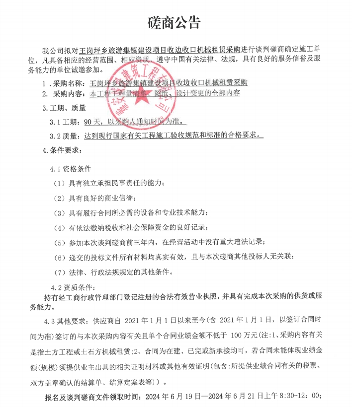王崗坪鄉(xiāng)旅游集鎮(zhèn)建設(shè)項(xiàng)目收邊收口機(jī)械租賃采購(gòu)談判磋商公告