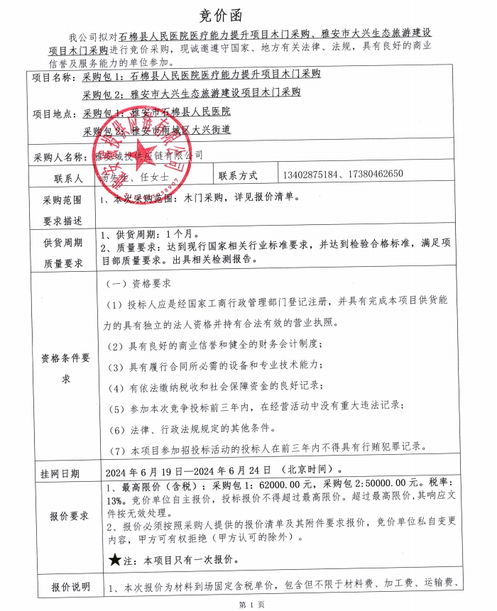 石棉縣人民醫(yī)院醫(yī)療能力提升項目木門采購、雅安市大興生態(tài)旅游建設(shè)項目木門采購競價公告