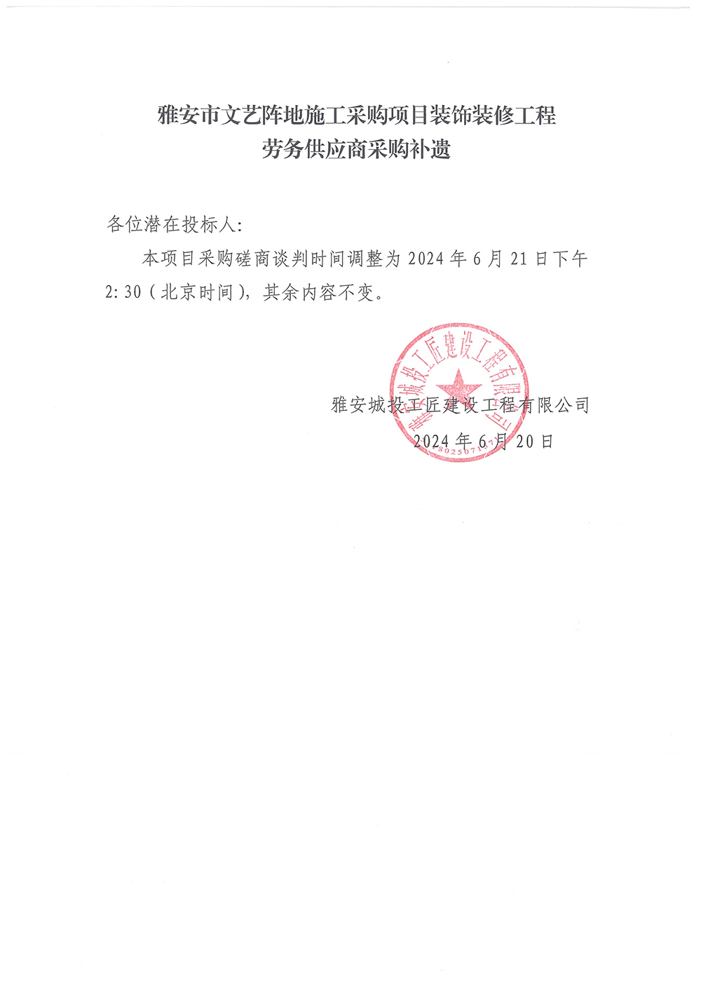 雅安市文藝陣地施工采購項目裝飾裝修工程勞務(wù)供應(yīng)商采購補(bǔ)遺