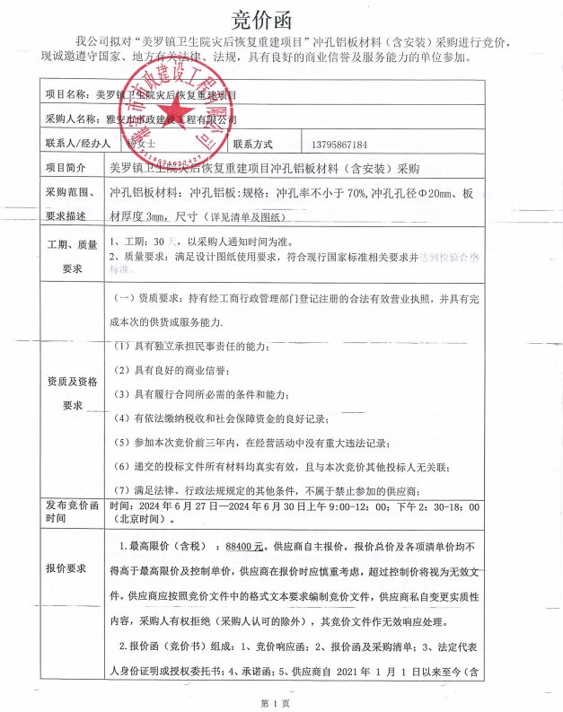 石棉縣美羅鎮(zhèn)衛(wèi)生院災后恢復重建項目沖孔鋁板材料(含安裝)采購競價公告