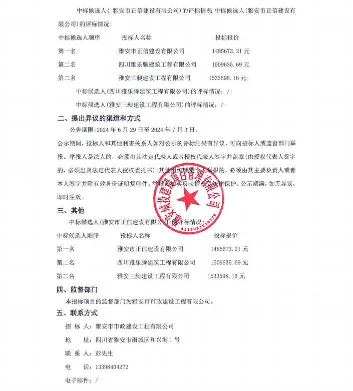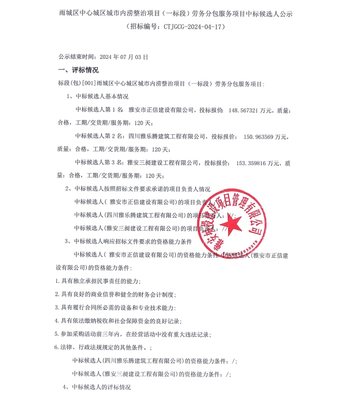 雨城區(qū)中心城區(qū)城市內澇整治項目(一標段)勞務分包服務項目中標候選人公示