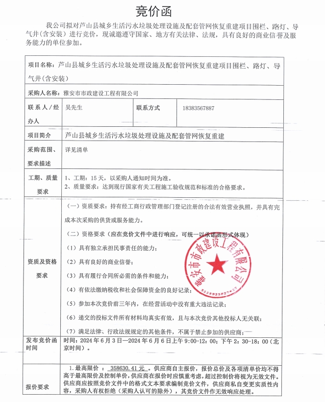 蘆山縣城鄉(xiāng)生活污水垃圾處理設施及配套管網(wǎng)恢復重建項目圍欄、路燈、導氣井(含安裝)采購競價公告