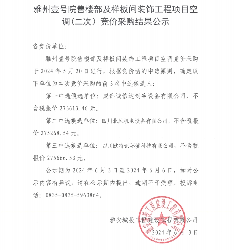 雅州壹號(hào)院售樓部及樣板間裝飾工程項(xiàng)目空調(diào)(二次)競(jìng)價(jià)采購(gòu)結(jié)果公示