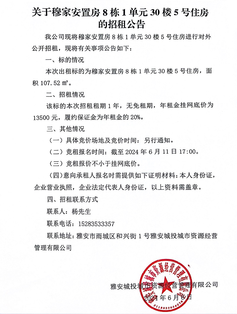 關(guān)于穆家安置房8棟1單元30樓5號(hào)住房的招租公告