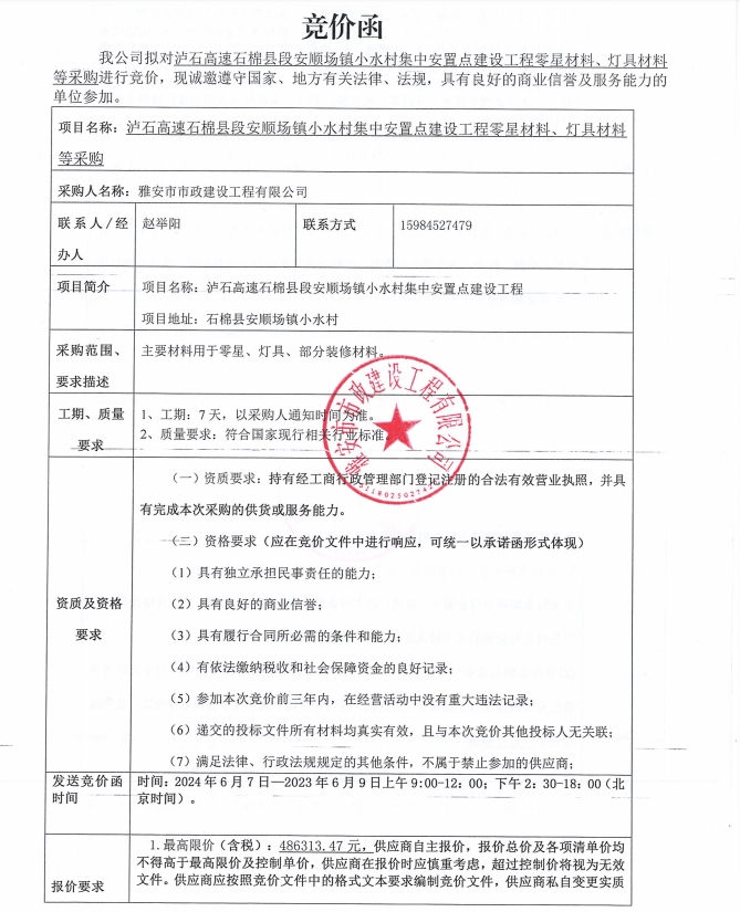 瀘石高速石棉縣段安順場鎮(zhèn)小水村集中安置點建設工程零星材料、燈具材料等采購競價公告