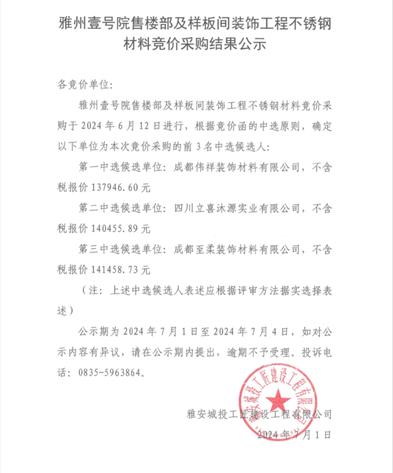 雅州壹號(hào)院售樓部及樣板間裝飾工程不銹鋼材料競(jìng)價(jià)采購(gòu)結(jié)果公示