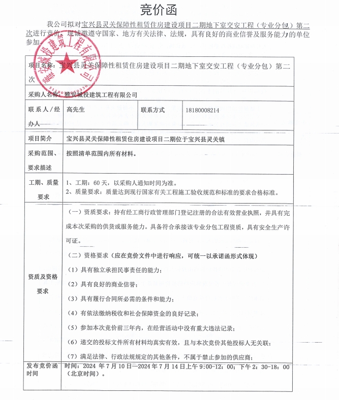 寶興縣靈關(guān)保障性租賃住房建設(shè)項目二期地下室交安工程(專業(yè)分包)第二次競價公告