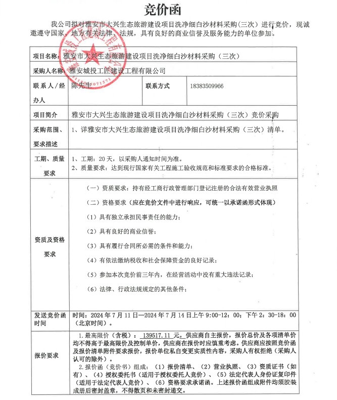 雅安市大興生態(tài)旅游建設(shè)項(xiàng)目洗凈細(xì)白沙材料采購(三次)競價(jià)公告