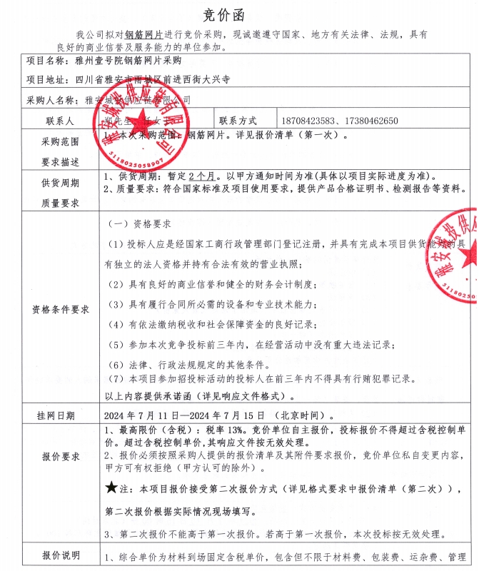 附件1:競(jìng)價(jià)函--雅州壹號(hào)院鋼筋網(wǎng)片采購