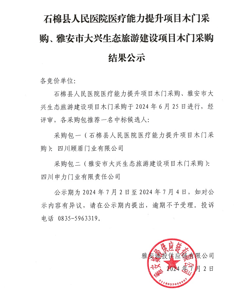 石棉縣人民醫(yī)院醫(yī)療能力提升項(xiàng)目木門采購、雅安市大興生態(tài)旅游建設(shè)項(xiàng)目木門采購結(jié)果公示