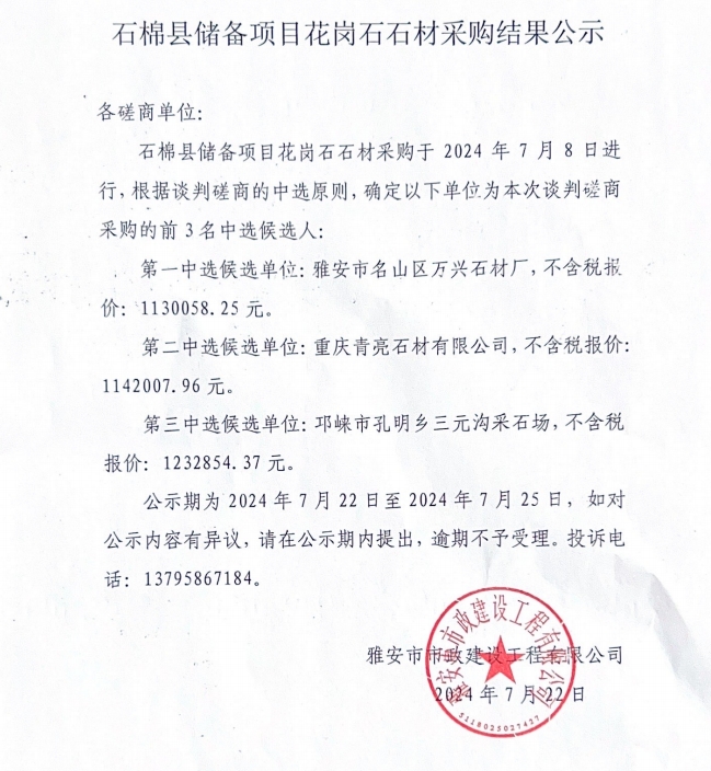 石棉縣儲備項(xiàng)目花崗石石材采購結(jié)果公示