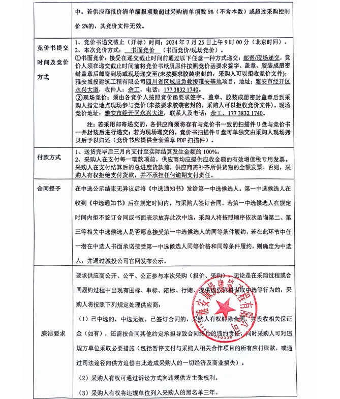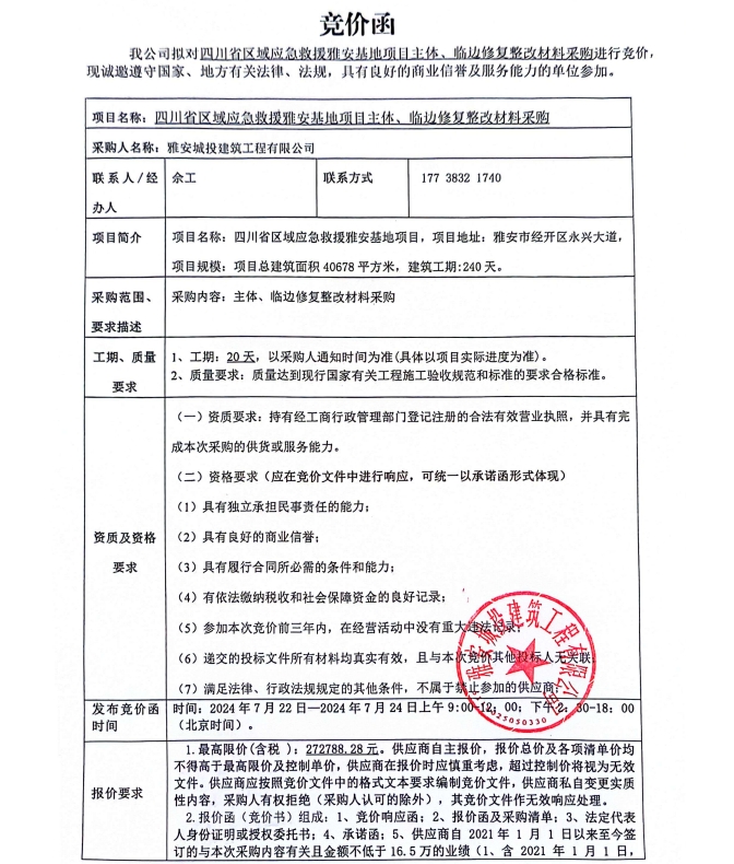 四川省區(qū)域應(yīng)急救援雅安基地項目主體、臨邊修復整改材料采購競價公告