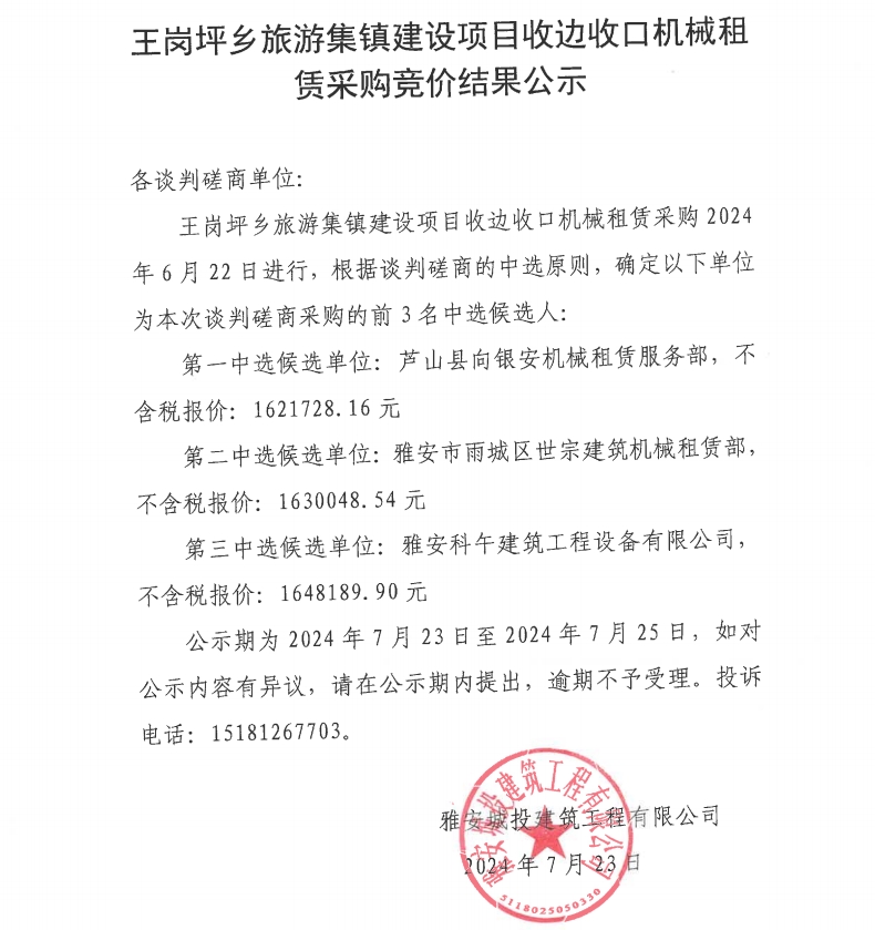 王崗坪鄉(xiāng)旅游集鎮(zhèn)建設項目收邊收口機械租賃采購競價結果公示