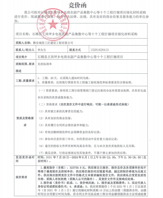石棉縣王崗坪鄉(xiāng)電商農(nóng)副產(chǎn)品集散中心等十個工程打捆項目綠化材料競價函