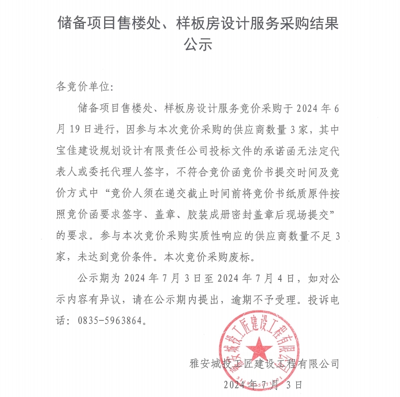 儲(chǔ)備項(xiàng)目售樓處、樣板房設(shè)計(jì)服務(wù)采購(gòu)結(jié)果公示