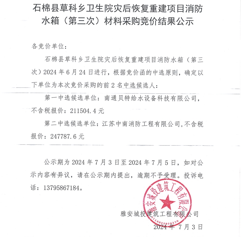石棉縣草科鄉(xiāng)衛(wèi)生院災(zāi)后恢復(fù)重建項(xiàng)目消防水箱(第三次)材料采購競(jìng)價(jià)結(jié)果公示