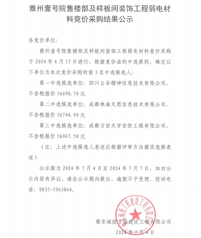 雅州壹號院售樓部及樣板間裝飾工程弱電材料競價采購結(jié)果公示
